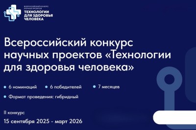 Приглашаем на Всероссийский конкурс научных проектов «Технологии для здоровья человека», нацеленный на выявление и поддержку перспективных технологий, которые могут быть внедрены в здравоохранение и другие сферы национальной экономики. Конкурс призван способствовать разработке инновационных решений, способных значительно улучшить качество жизни и укрепить здоровье граждан Российской Федерации.