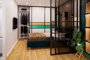 - Стеллаж с раздвижной панелью сочетает систему хранения на стеллаже с одной или двумя раздвижными панелями (стеклянными, деревянными, из МДФ), закрывающими проход между зонами. Днём панели открыты, спальня визуально связана с гостиной. Вечером панели закрываются, создавая изолированное пространство.